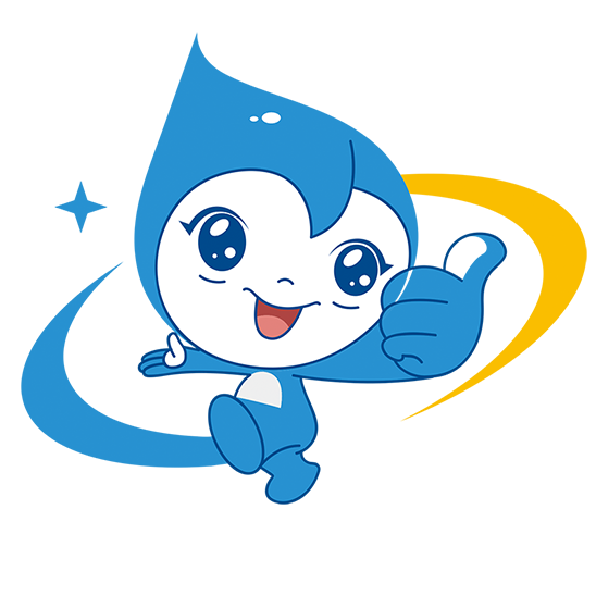 由水滴吉祥物、月牙弧線、四芒星、字體結合而成,藍白色和諧潔凈,黃色清新活力整體洋溢著快樂、靈動。