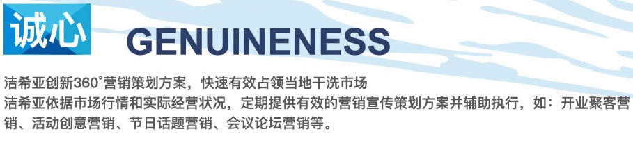潔希亞國際洗衣依據(jù)市場行情和實(shí)際經(jīng)營狀況,定期提供有效的營銷宣傳策劃方案并輔助執(zhí)行,如:開業(yè)聚客營銷、活動(dòng)創(chuàng)意營銷、節(jié)日話題營銷、會(huì)議論壇營銷等。